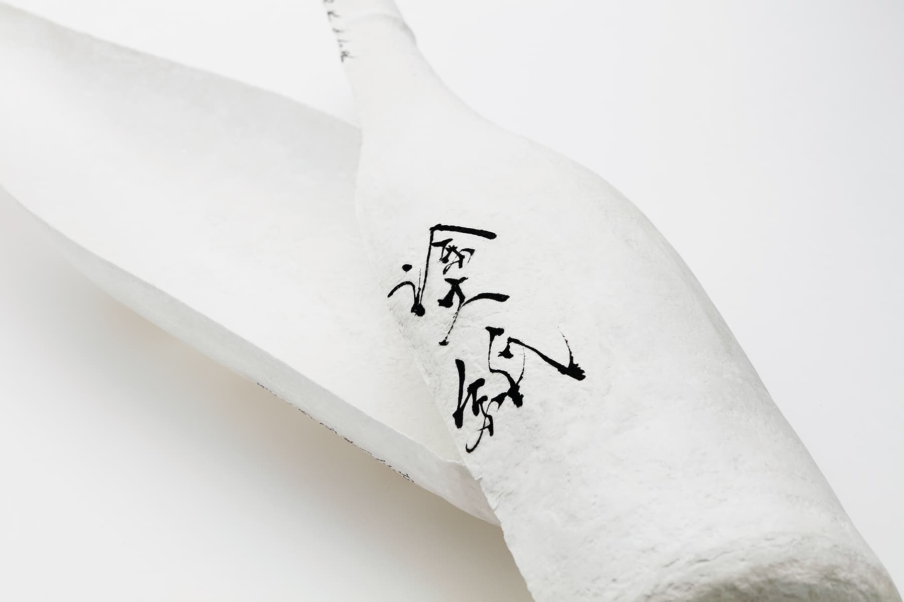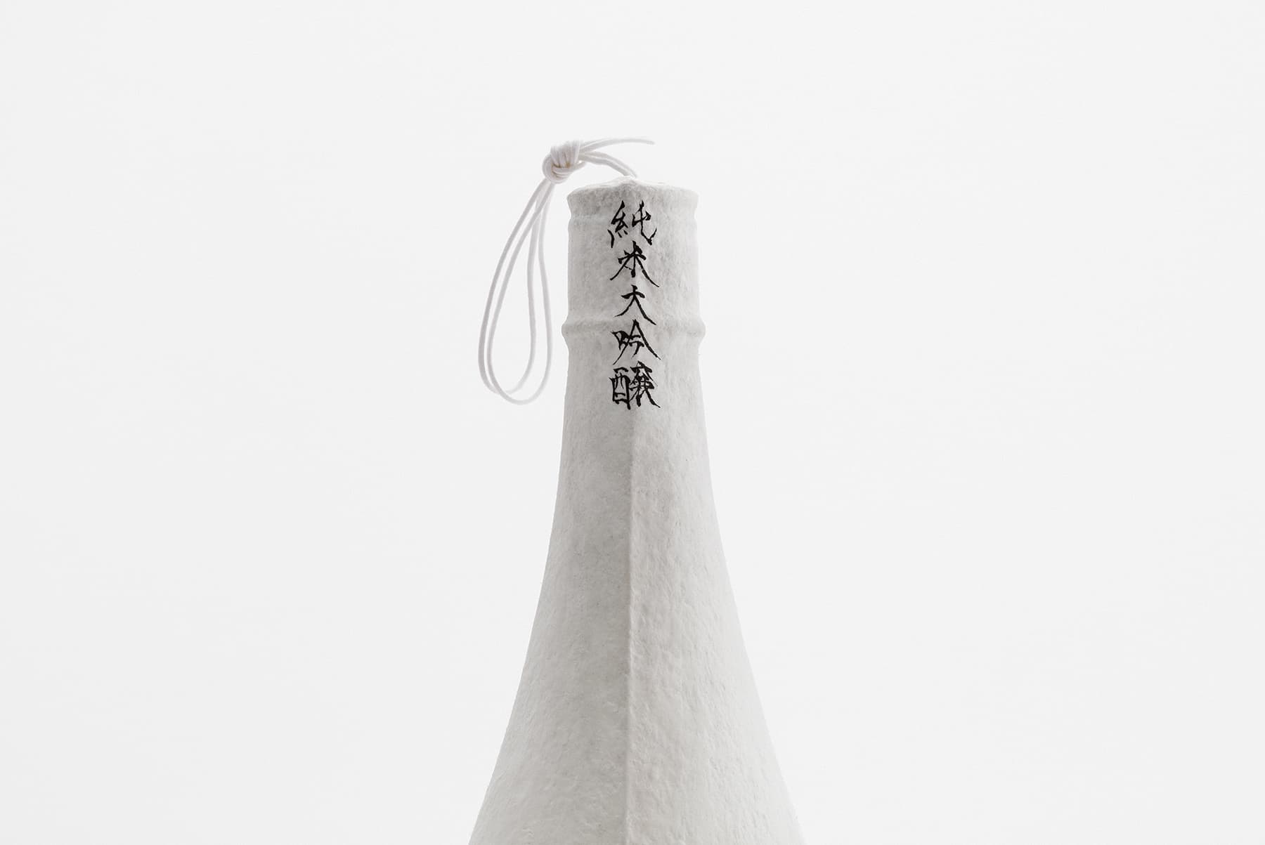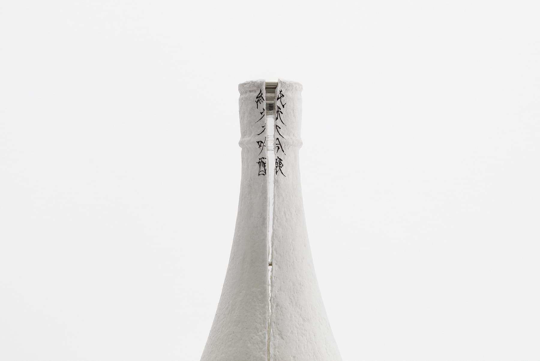 今回の展示では、塗紙の「日本酒のパッケージ」としての可能性を探求した。日本酒は本来、その特性から着色瓶や箱を使用する必要があったが、塗紙は紫外線の遮蔽効果を有するため、瓶表面に塗紙を直接数回塗り重ねるだけでパッケージが完成する。瓶の細部にまで隈なく紙の繊維で包まれたビジュアルは“繭”のようでもあり、その中身が繊細でかけがえのない存在であることを想起させる。瓶全体がキャンバスとして機能するため、基本表示に加えて “書”を添えることもできる。瓶上部の糸を引くことで、日本酒が薄い膜を破り徐々に姿を現す様子は、さながら “孵化”のようでもある。この一連の所作は、日本酒の繊細な息づかいを映し出した新しい“日本酒の体験”とも言えるのではないだろうか。