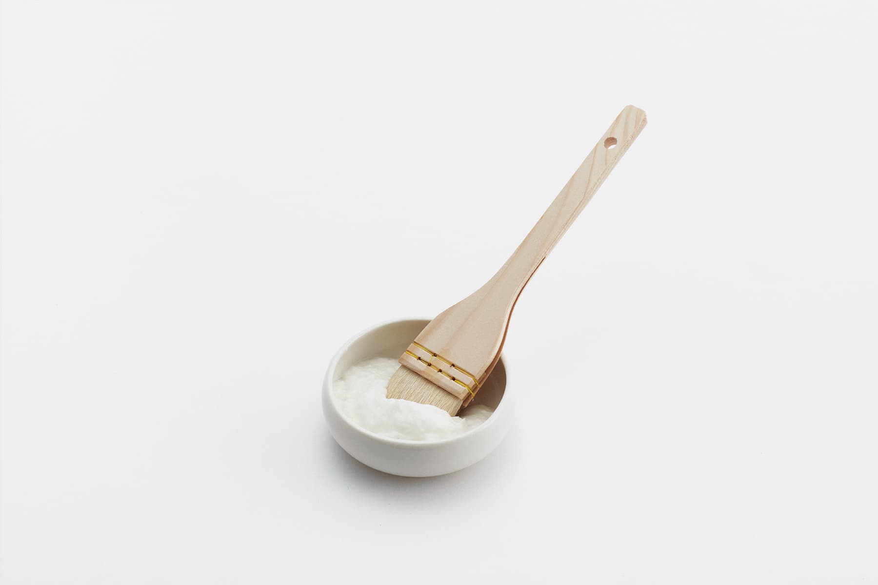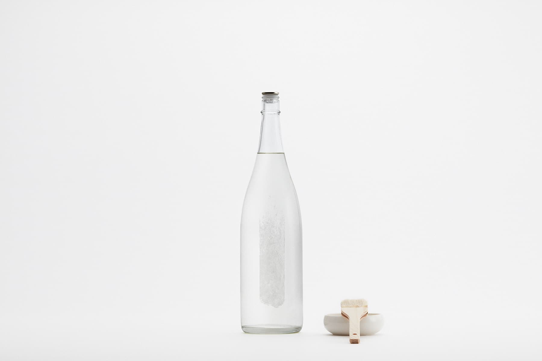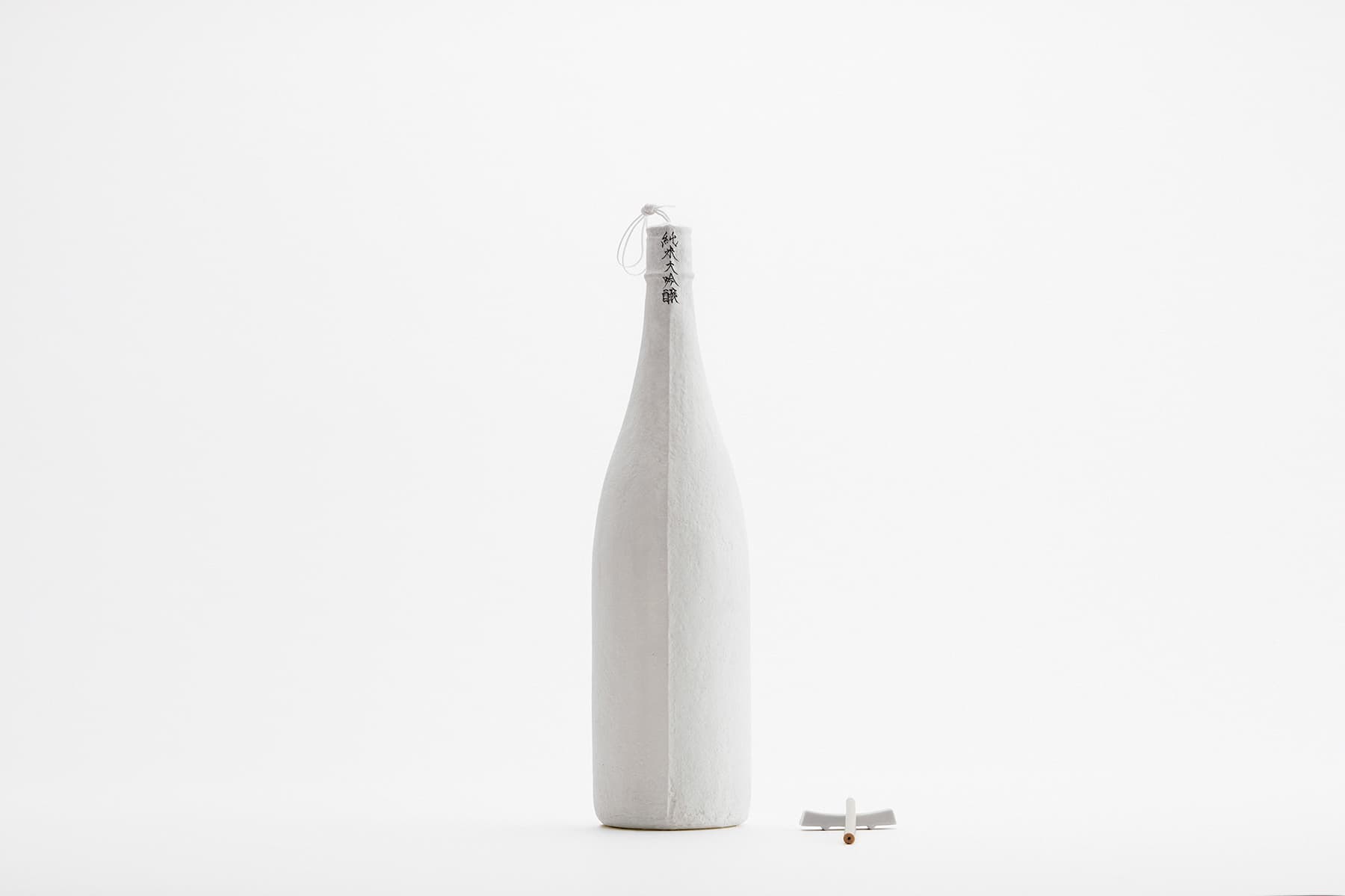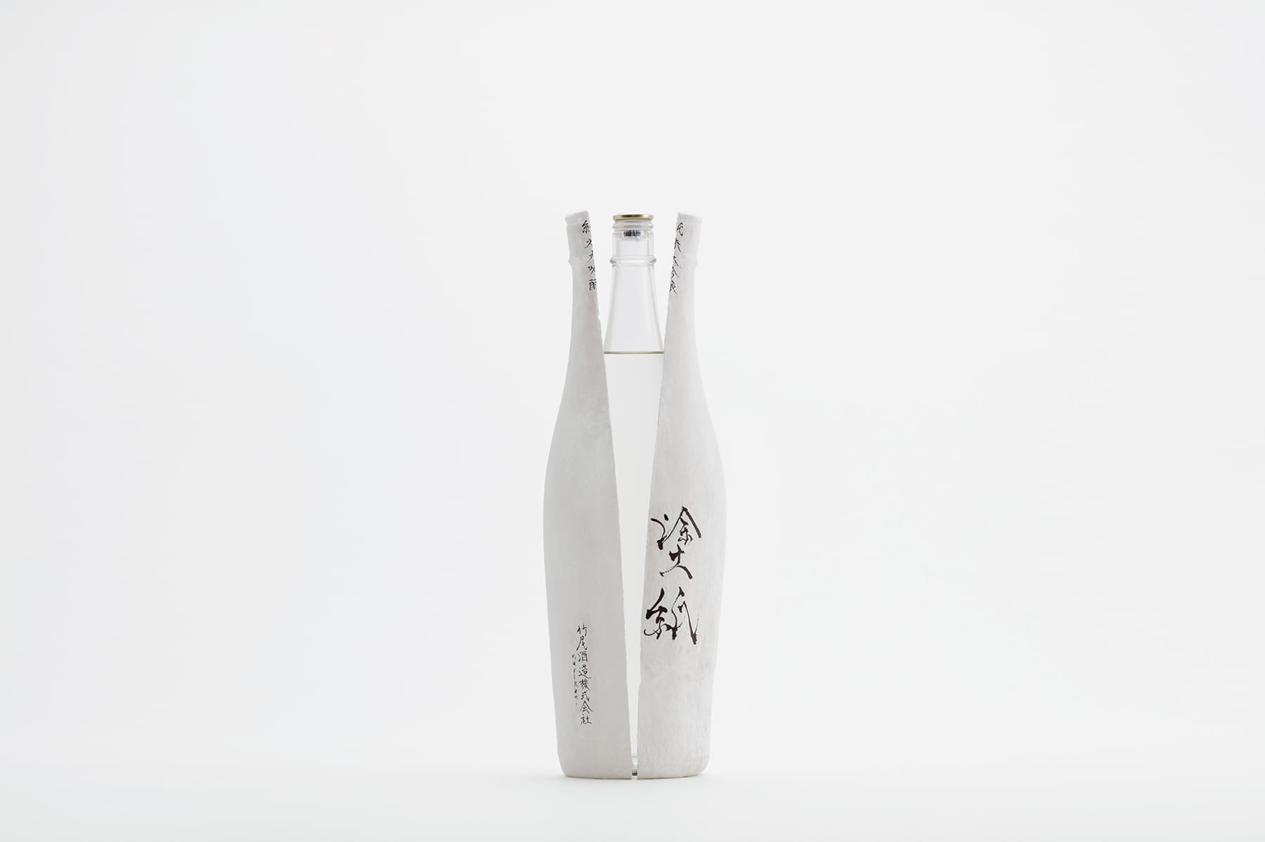 今回の展示では、塗紙の「日本酒のパッケージ」としての可能性を探求した。日本酒は本来、その特性から着色瓶や箱を使用する必要があったが、塗紙は紫外線の遮蔽効果を有するため、瓶表面に塗紙を直接数回塗り重ねるだけでパッケージが完成する。瓶の細部にまで隈なく紙の繊維で包まれたビジュアルは“繭”のようでもあり、その中身が繊細でかけがえのない存在であることを想起させる。瓶全体がキャンバスとして機能するため、基本表示に加えて “書”を添えることもできる。瓶上部の糸を引くことで、日本酒が薄い膜を破り徐々に姿を現す様子は、さながら “孵化”のようでもある。この一連の所作は、日本酒の繊細な息づかいを映し出した新しい“日本酒の体験”とも言えるのではないだろうか。